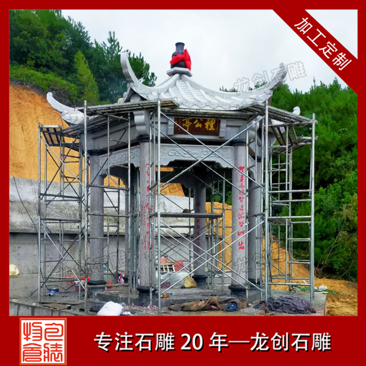1、安裝石涼亭柱底石墩:在地基平面上分布好位置,安放石亭子柱子底石墩,所有石墩安放要在同一水平上,安放時要保持地面潮濕,并安排一些水泥,起到固定石墩的作用,待水泥凝固之后,才可以進行下一步的安裝。