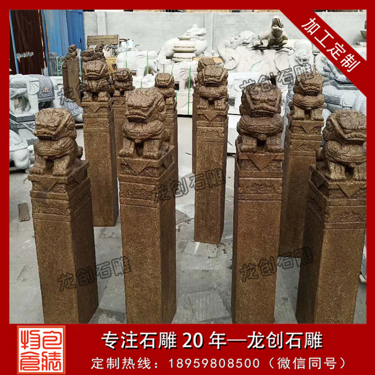 石雕拴馬樁樣式齊全、規格不一,常見的石雕拴馬樁都是方20cm的柱子,高度在1.5-2.0米之間,其最主要的不同便體現在它最上面的柱頭上。石雕拴馬樁的柱頭雕刻樣式很多,有雕刻獅子的、雕刻麒麟的還有雕刻