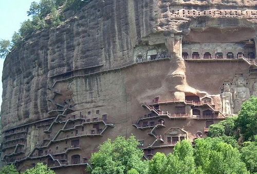 麥積山石窟為中國四大石窟之一,其它三窟為:龍門石窟、云岡石窟和敦煌莫高窟。麥積山石窟屬全國重點(diǎn)文物保護(hù)單位,也是聞名世界的藝術(shù)寶庫。麥積山位于甘肅省天水市東南約35公里處,是我國秦嶺山脈西端小隴山中的一座奇峰,海拔1742米,但山高離地面只有142米,山的形狀奇特,孤峰突起,猶如麥垛,因此人們稱之為麥積山。