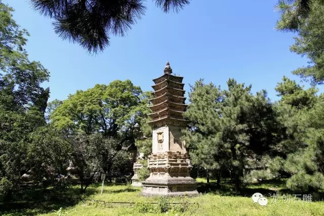 潭柘古剎,歷經了十多個朝代,規模宏大,曾有難以數計的僧人在這里修行,并終老于此,因而在寺院附近留下了數量眾多的僧人墓塔。如今在寺前的塔林內完好的保存著形式多樣的歷代佛塔七十余座。下塔院的塔林埋葬著金、元、明三代的部分高僧,塔形不一,種類較多,有石經幢式塔、方形單層浮層屠式塔、密檐式磚塔和覆缽形藏式石塔。塔林中最高大的墓塔要數金代的廣慧通理禪師塔,此塔位于下塔院的中心,塔高九層,也是密檐式實心磚塔,塔前設有寬大的石供桌,塔前左右兩側還各有一株千年娑羅樹。