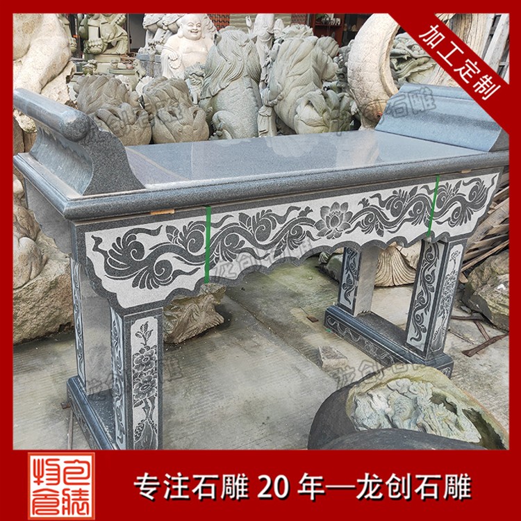 雕刻技法豐富:石雕供桌的制作運用了多種雕刻技法。浮雕是其中常見的一種,通過在供桌表面雕刻出凸起的圖案,可以表現出花卉、人物、瑞獸等各種元素。比如在桌面邊緣雕刻精美的花卉浮雕,牡丹象征富貴,蓮花代表高潔,這些浮雕不僅增加了供桌的美觀度,還賦予了其文化內涵。透雕技法則常用于供桌的腿部或其他裝飾部分,使圖案具有通透感,增加了藝術層次感。例如,將腿部雕刻成帶有吉祥瑞獸造型的透雕,瑞獸形態逼真,仿佛在守護供桌。圓雕也會應用在一些供桌上的獨立裝飾擺件上,如小型的佛像、獅子等,這些圓雕作品立體感強,栩栩如生。