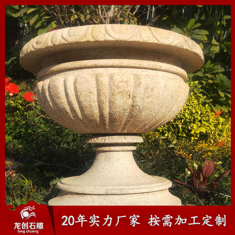 黃銹石石雕花盆花缽和黃金麻石雕花盆不但具有天然石材質(zhì)地堅硬、耐磨、極具重量感的特征,更為難得的是花缽表面的質(zhì)感以及強(qiáng)烈的可塑性和表現(xiàn)力,可使花缽盡顯各種不同的藝術(shù)風(fēng)格。它可雕塑成各式特色花缽:歐式花缽、現(xiàn)代花缽、古典花缽、圓形花缽、長方形花缽、方形花缽、四方形花缽。還可在花缽上雕刻動物、人物形成動物花缽、人物花缽。