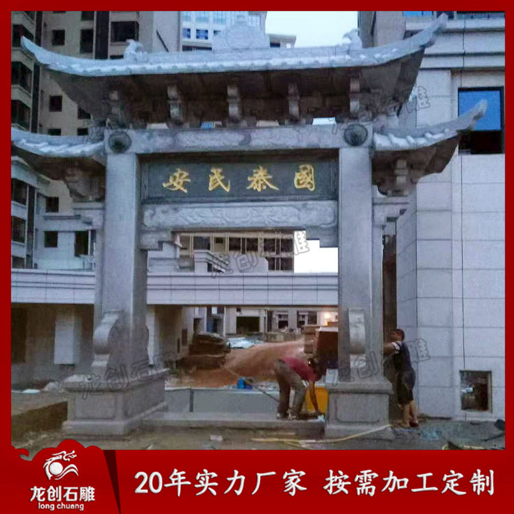 下圖是三門三樓樣式的農村牌坊,也叫做農村牌樓,屬于經典傳統(tǒng)樣式,也是我們石牌坊廠家制作的比較多的一種,我們出廠的農村牌坊是設計、制作、安裝于一體的石牌坊廠家,我們注重石牌坊工藝和圖片樣式設計制作,每一步都追求精益求精,我們所制作的農村石牌坊秉承“以誠為本,以質量求生存”的經營理念,制作出超前富有創(chuàng)意的農村大門石牌坊,真誠為了美化農村環(huán)境,美化農村生活貢獻一份力量。