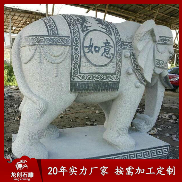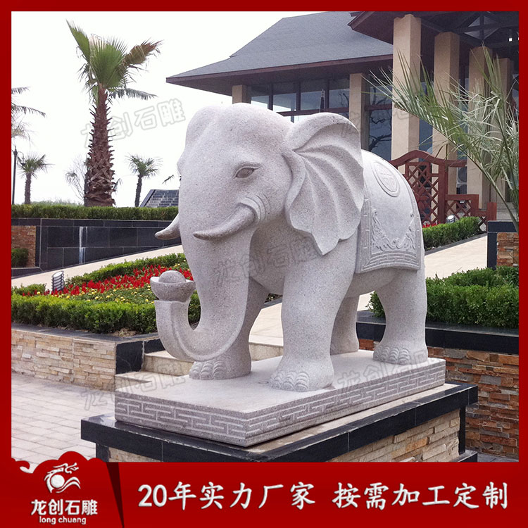 石雕大象造型各異,從鼻子來看,就有分鼻子朝上、鼻子朝下、鼻子朝內、鼻子朝外。象諧“祥”音,所以常有吉象之稱,適合擺放在酒店別墅、企業、寺廟門口等各種場景。