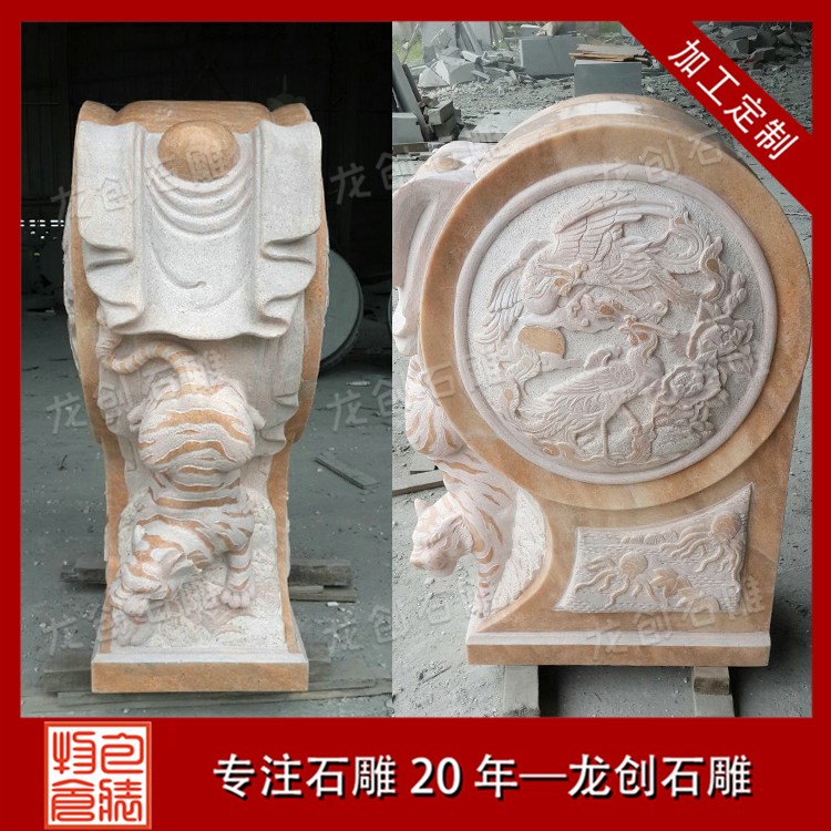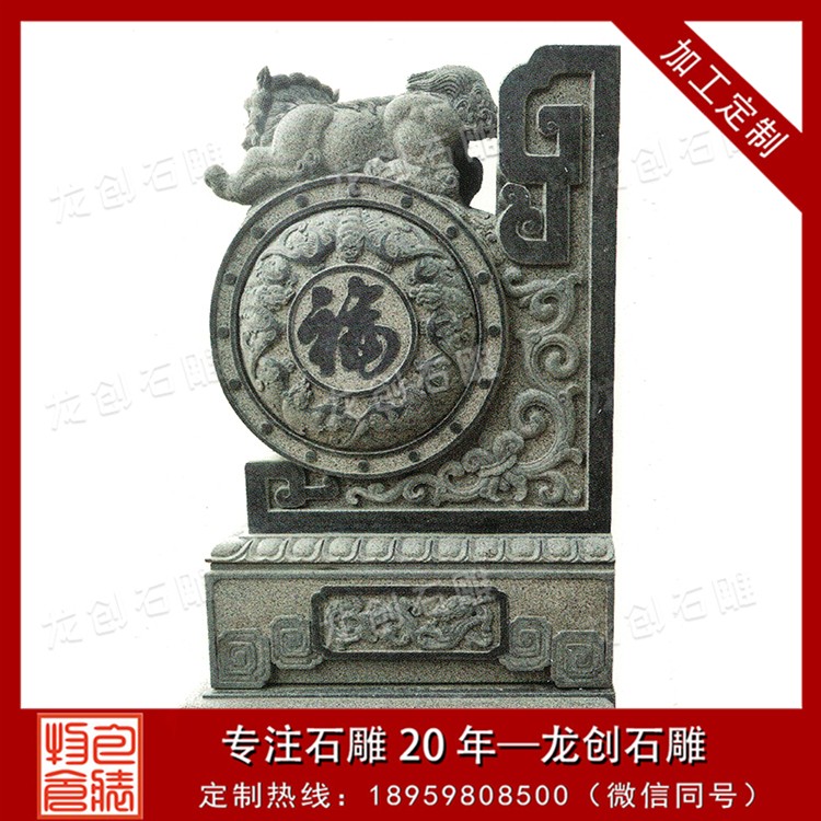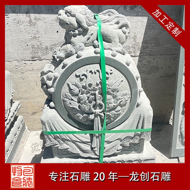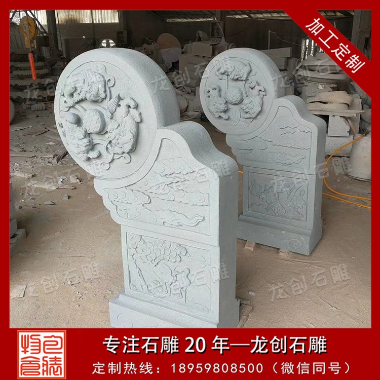 3.浮雕與線雕結(jié)合:在抱鼓石的雕刻過程中,浮雕和線雕技藝常被結(jié)合使用。浮雕通過使形象從背景中凸出來,增強畫面的立體感和空間感。在抱鼓石的兩側(cè),常采用浮雕技藝刻畫各種圖案和紋飾,如角蓮、麒麟臥松等。而線雕則主要通過刻線來展現(xiàn)細節(jié)和紋理,使石雕更加細膩和美觀。在細加工階段,雕刻師傅會根據(jù)設(shè)計稿和石材的特性,靈活運用這兩種技藝,使抱鼓石既具有藝術(shù)美感,又符合實用要求。
