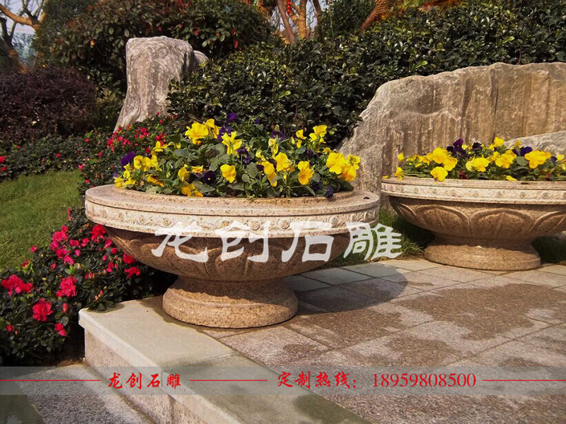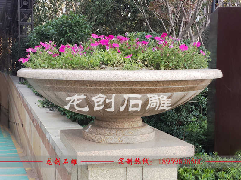 花缽制作材料可以是花崗巖,砂巖,大理石,芝麻白,等。花缽美麗的色澤還能保存百年以上,顏色美觀,格調高雅,花色繁多,剛性好,溫度變形小,保養方便簡單,使用壽命很長。